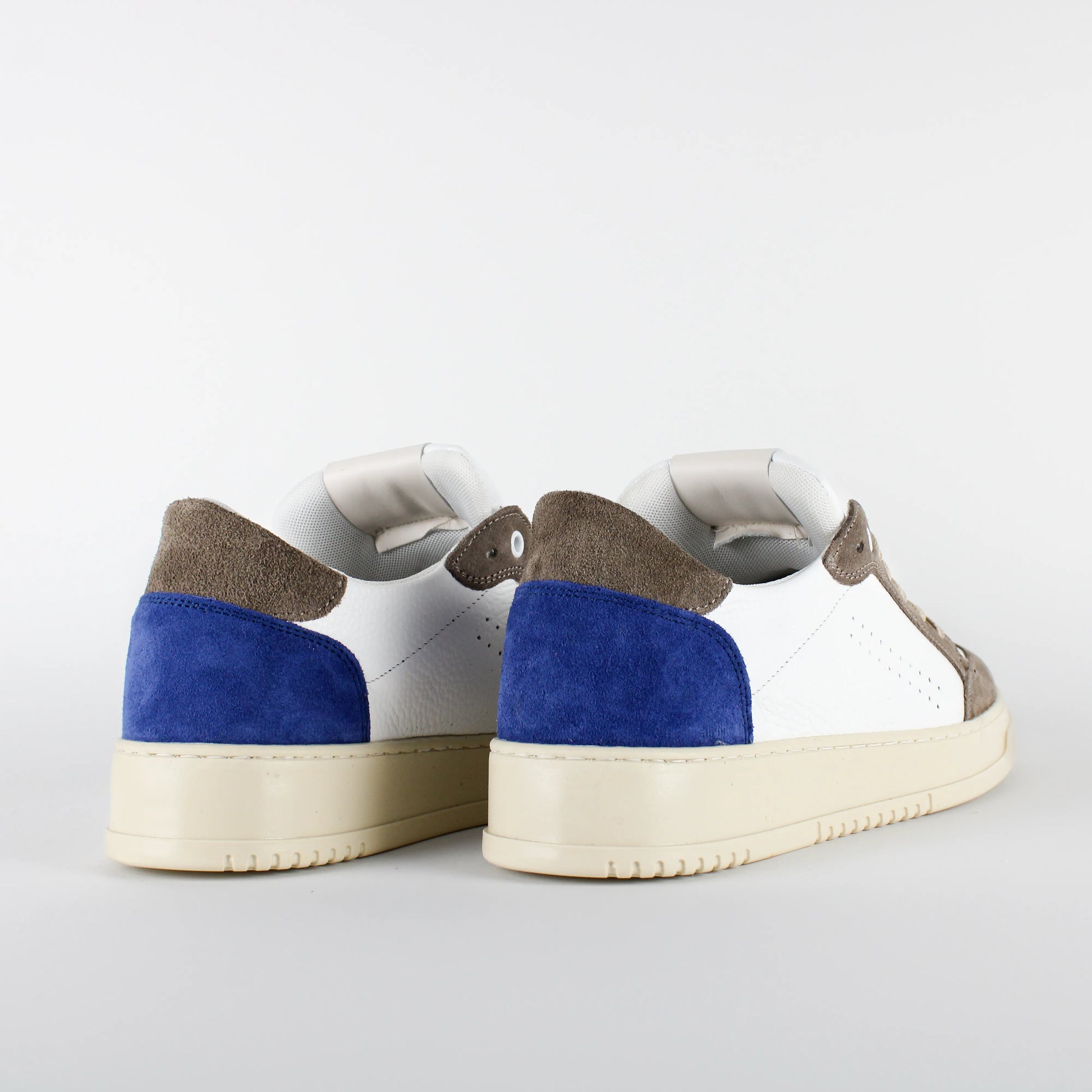 Combina pelle bianca bottolata , dettagli in camoscio taupe e blu navy, per un look unico e dinamico.